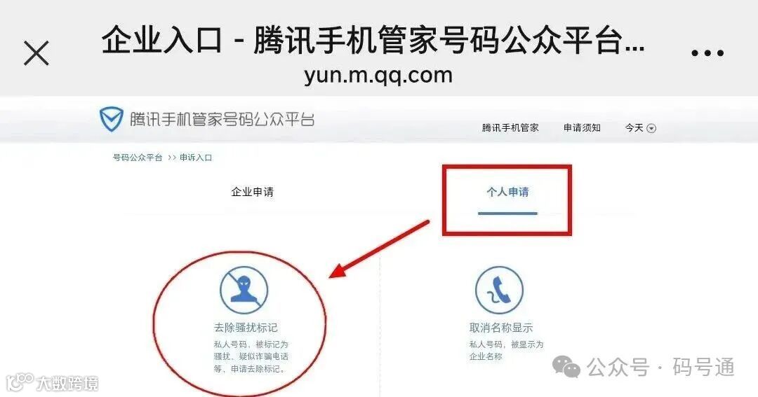 个人和企业用户均可操作,登录腾讯手机管家号码公众平台官网,个人用户点“个人申请”下的“个人入口”,选“去除骚扰标记”或“取消名称显示”;企业用户则登录企业号码申诉官网选对应申诉类型。按要求填号码、验证码等信息,企业需额外上传加盖公章的营业执照等材料,填写申诉说明后提交。