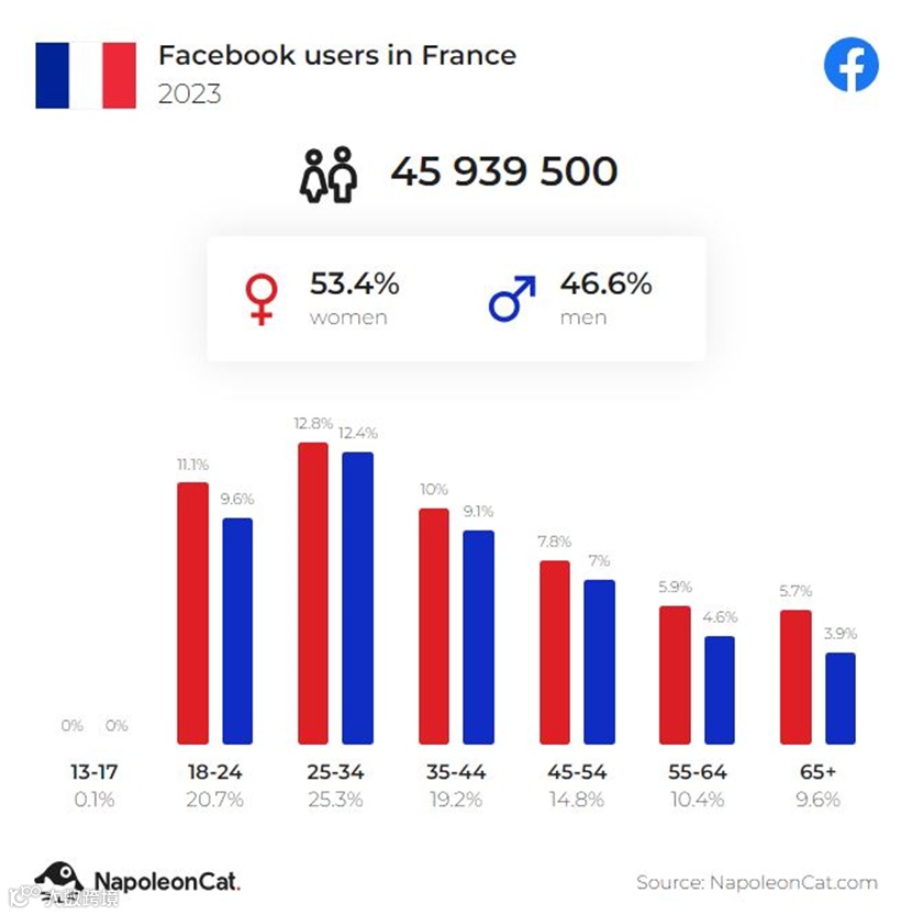 截至2023年9月,法国有45,939,500名Facebook用户,占总人口的69%。