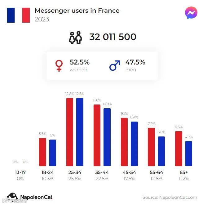 截至2023年9月,法国有32,011,500名Messenger用户,占总人口的48.1%。