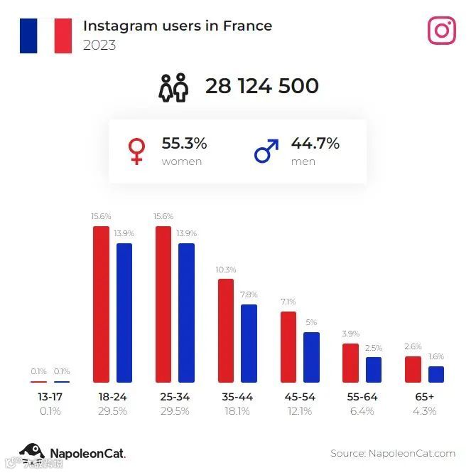 截至2023年9月,法国有28,124,500名Instagram用户,占总人口的42.2%。