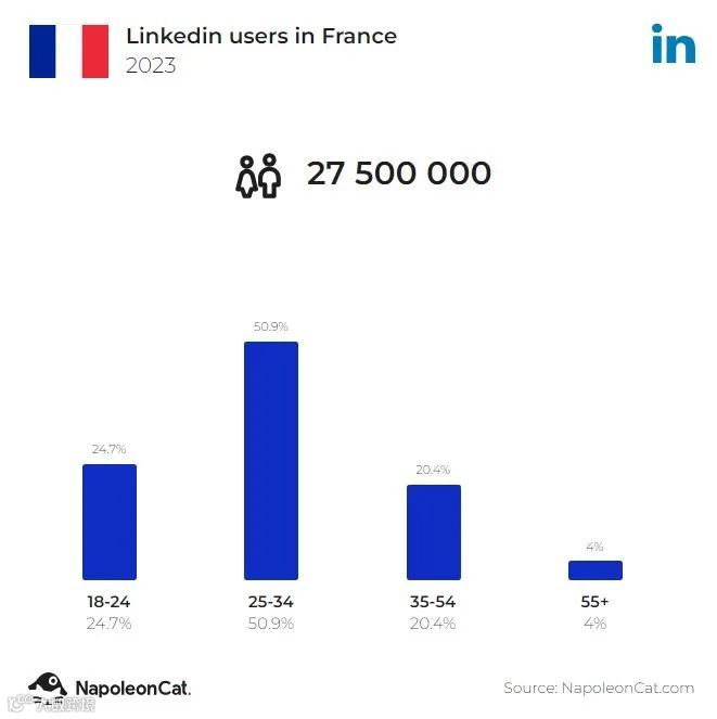 截至2023年9月,法国共有27,500,000名Linkedin用户,占总人口的41.3%。