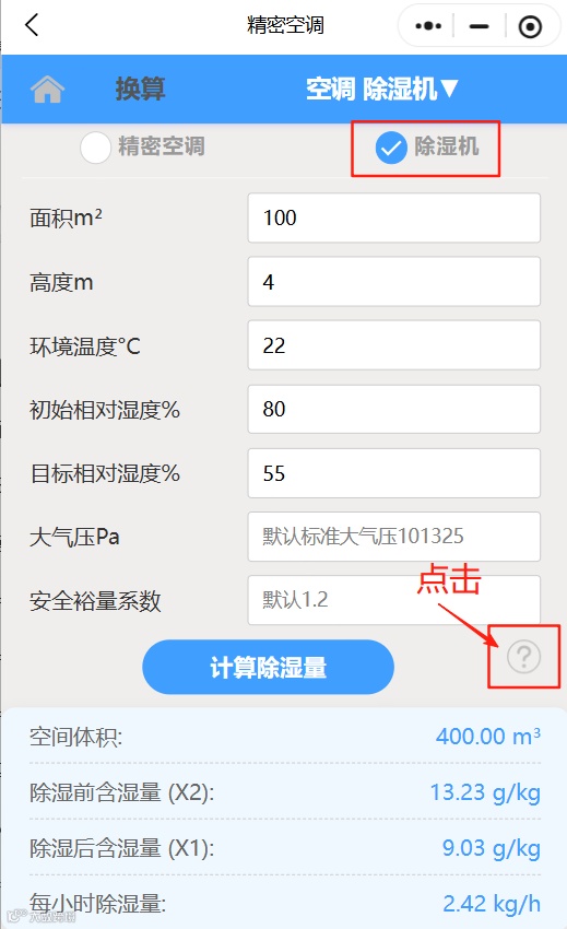 某机房面积100 m²,层高4 m,空调设定温度22℃,当前相对湿度80%,目标湿度降至55%。求所需除湿机的除湿量。