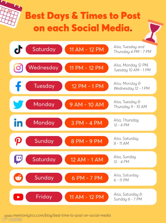 另外,社交媒体发布的最佳时段通常为下午9点至10点(美国东部标准时间)。