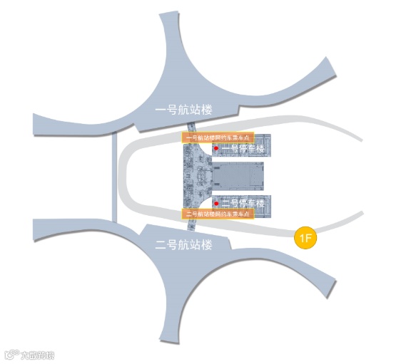 设置有网约车1、网约车2专属乘车区域,分别位于1号停车楼和2号停车楼L1层,并配备旅客休息区。