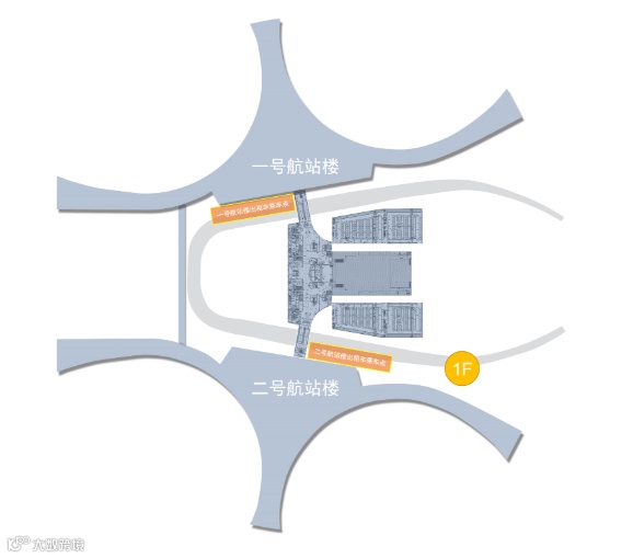 出租车站台分别位于1号航站楼与交通中心连接段G02号门外侧地面层、2号航站楼与交通中心连接段GO4号门外侧地面层。