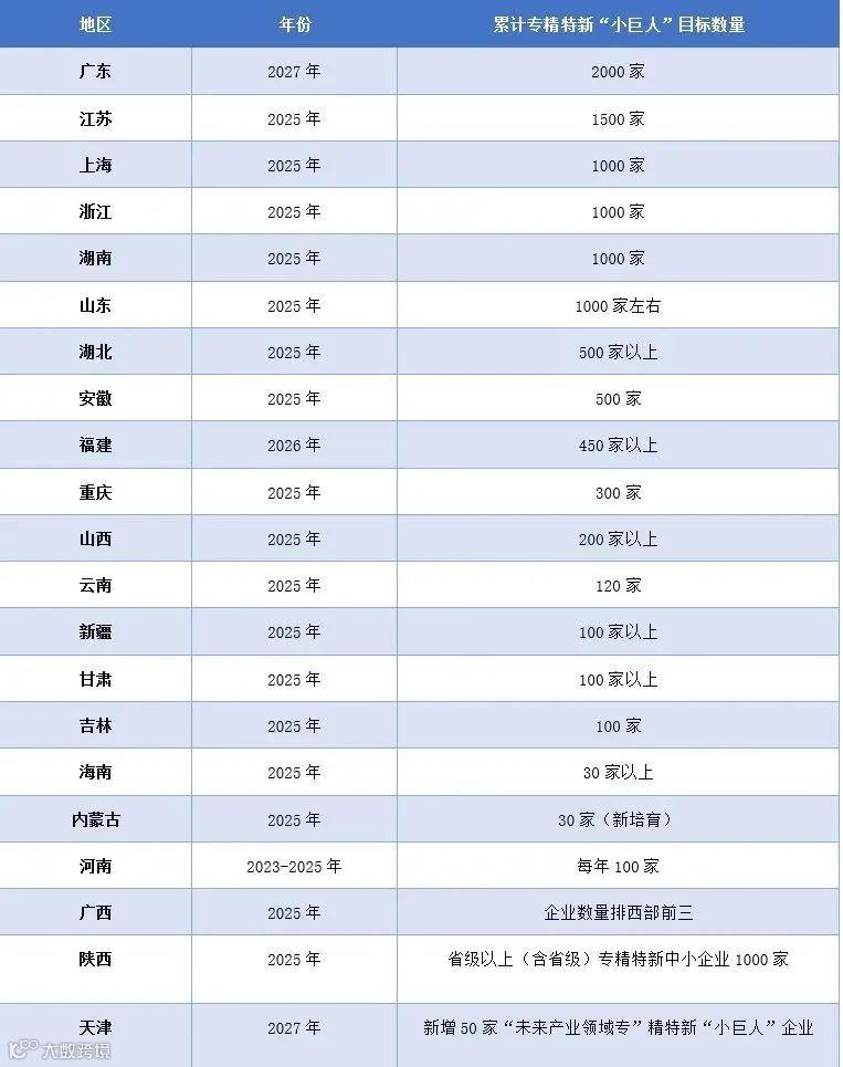 表1:部分省级行政区专精特新“小巨人”培育目标