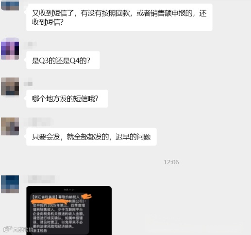 消息迅速在行业社群传播,引发广泛关注。部分卖家不仅收到四季度预警,还被同步提示2025年第三季度和第四季度连续两个季度申报收入与平台报送数据不符。