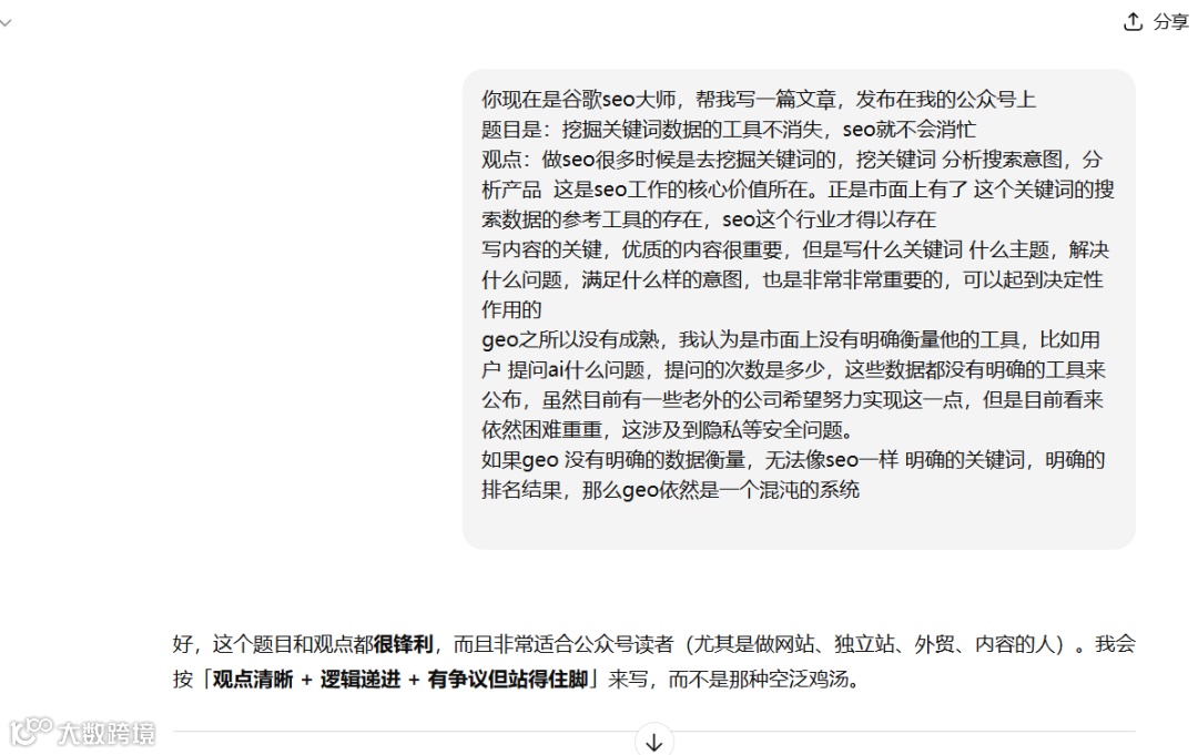 在没有明确数据之前,所有所谓的 GEO 优化,本质上都只能依赖经验和猜测。你很难像做 SEO 那样,明确知道自己在优化哪个“词”,当前处于什么“位置”,以及优化是否真的带来了可持续的曝光。这并不是能力问题,而是系统层面的问题。涉及隐私、平台封闭和数据垄断,这些都决定了 GEO 短期内不可能像 SEO 一样成熟。