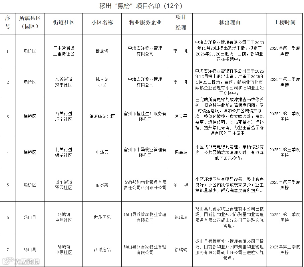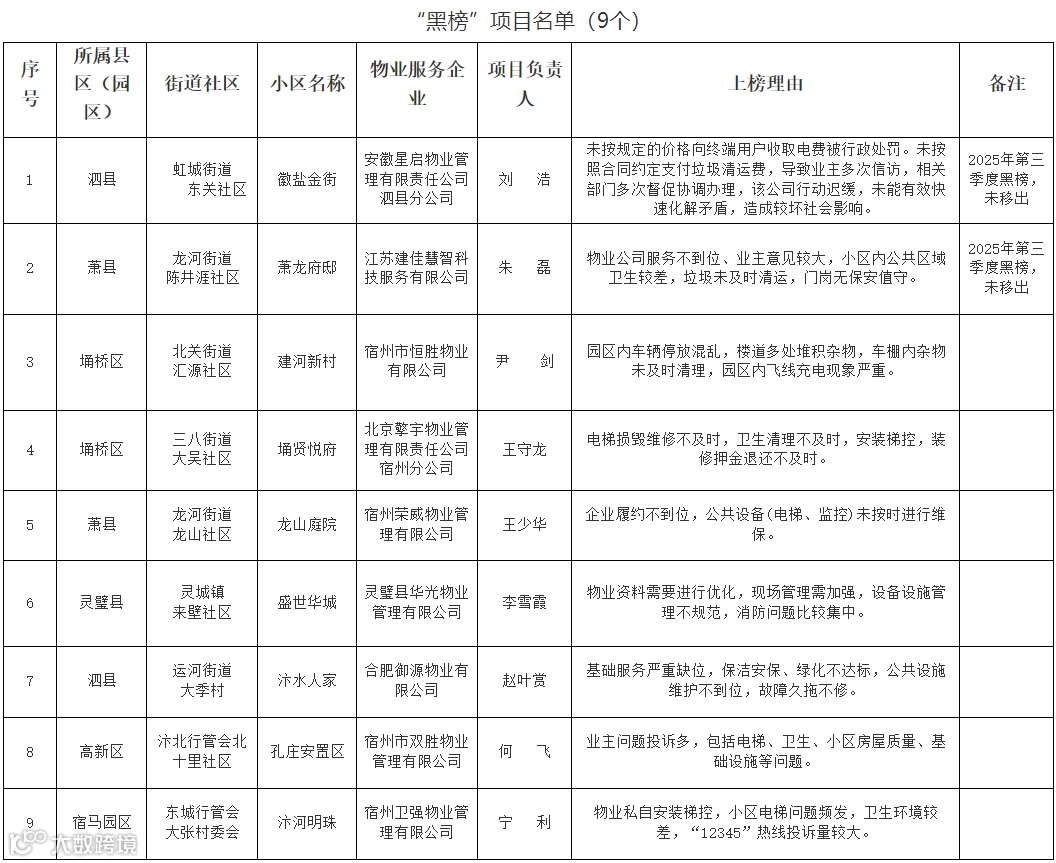 为进一步加强物业行业监管,督促提升物业服务质量和水平,按照《关于印发<宿州市物业服务企业信用管理办法>的通知》(宿房〔2021〕44号)、《关于建立住宅小区物业服务项目“红黑榜”制度的通知》(宿房〔2023〕88号)、《关于做好“黑榜企业”整改复查工作的通知》有关规定,根据各县区(园区)物业服务项目服务质量测评、日常监督管理、信访投诉处理等情况,现将文玺台、两淮融景苑、融翔御府等9个项目列入“红榜”,徽盐金街、萧龙府邸、建河新村等9个项目列入“黑榜”,卧龙湾、桃李苑小区、银河绿苑北区等12个项目移出“黑榜”,并予以通报。