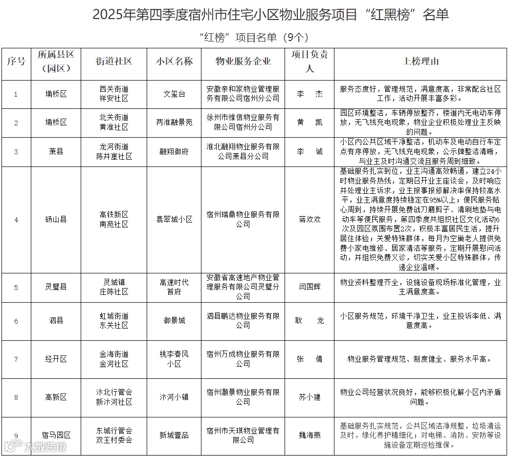 通报!2025年第四季度宿州市住宅小区物业服务项目“红黑榜”发布