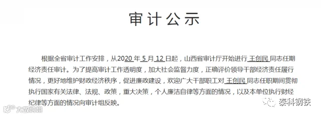 王创民离任后,山西省审计厅于2020年5月启动对其任期经济责任审计,重点核查重大决策执行、个人廉洁自律及企业财经纪律落实情况。