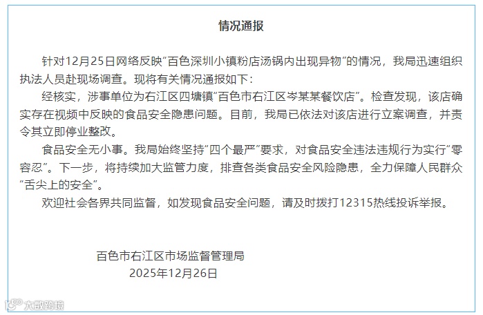 针对12月25日网络反映“百色深圳小镇粉店汤锅内出现异物”的情况,我局迅速组织执法人员赴现场调查。现将有关情况通报如下:经核实,涉事单位为右江区四塘镇“百色市右江区岑某某餐饮店”。检查发现,该店确实存在视频中反映的食品安全隐患问题。目前,我局已依法对该店进行立案调查,并责令其立即停业整改。