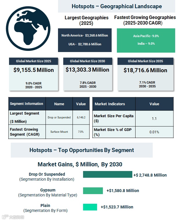 到2030年,最重要的增长机会预计出现在悬挂式天花板系统、石膏基天花板产品和商业建筑项目中。预计美国将产生最大的市场价值绝对增量,到2030年增加12.23亿美元。