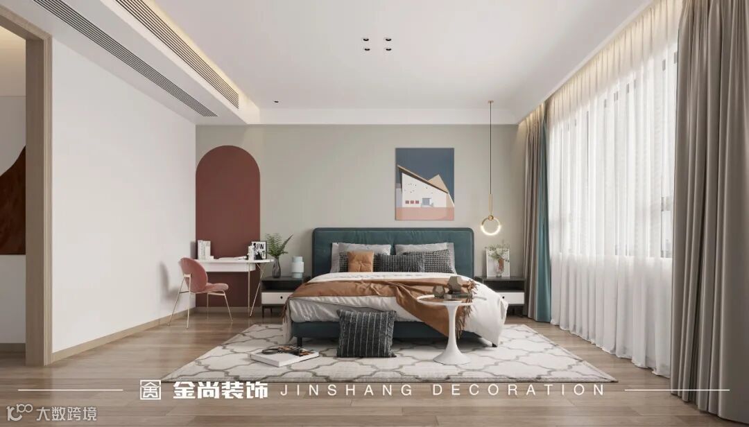 The master bedroom suite is separated from the cloakroom, so there is enough space to design the master bedroom and create a private cloakroom and bathroom, with both luxury and practicality. Clothes, bags, accessories, etc. are arranged in order to show the master's elegant fashion dream. The calm elegance of the day and the private tranquility of the night are in this free world. The bedroom space is made of natural materials. The gray background at the head of the bed creates a sense of nature. Pure bedding brings fresh wind. The dresser next to the head of the bed is very practical for the hostess to make up and remove makeup.