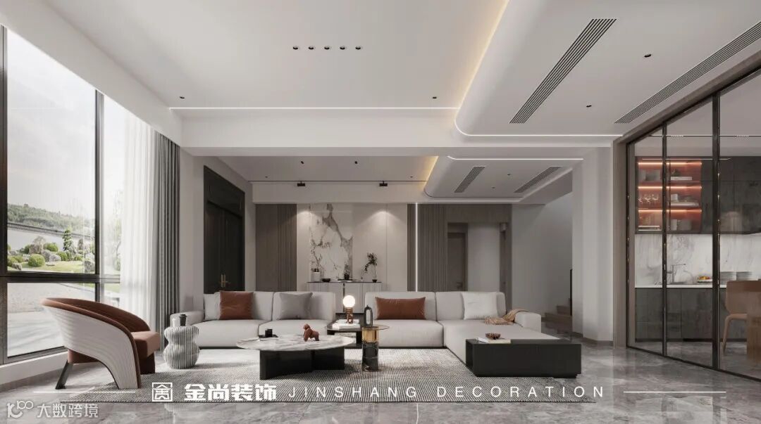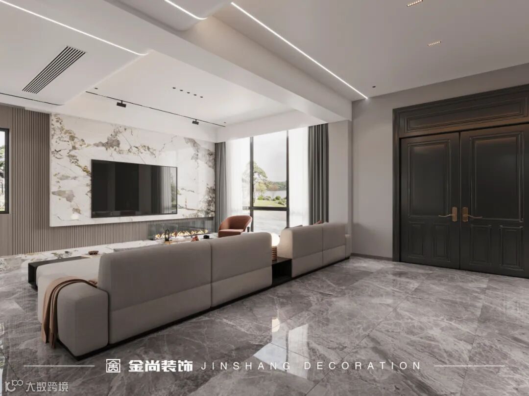 Walking into the living room, the whole living room area comes into view. The exquisite American parapet with antique bricks gives the TV background more modern fashion elements and a stable atmosphere. The beam body of the living room is designed with a smooth sense of line, breaking the inherent concept of elegant and light luxury space. The light belt is used to connect the living room and restaurant. At a glance, it can pull up the sense of space extension. Coupled with the echo of simple and atmospheric floor to ceiling windows, it virtually injects temperature into the space. The floor of the living room and the background wall also adopt the rock plate, and the soft natural texture makes the space full of texture. The double color sofa of gray and coffee is atmospheric and stable, and the combination of hardness and softness is just right, making the space more complete and unified.