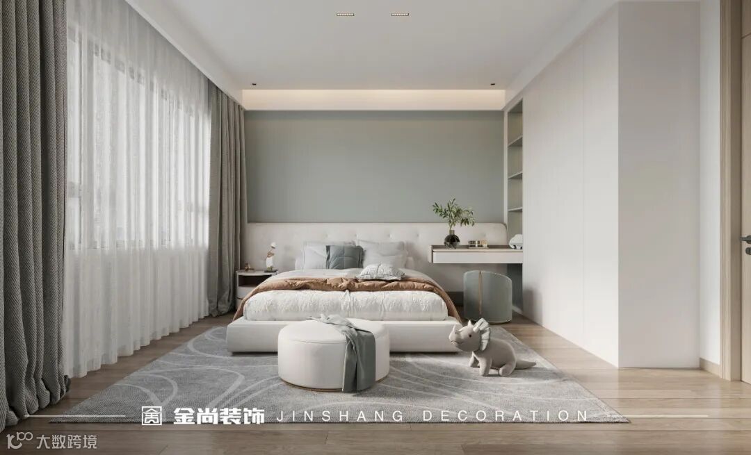 Abandoning the colorful and interesting style, the children's room is spread out with a calm gray tone, decorated with light blue pillows and carpets, and the overall white gives a quiet, elegant and gently luxurious room.