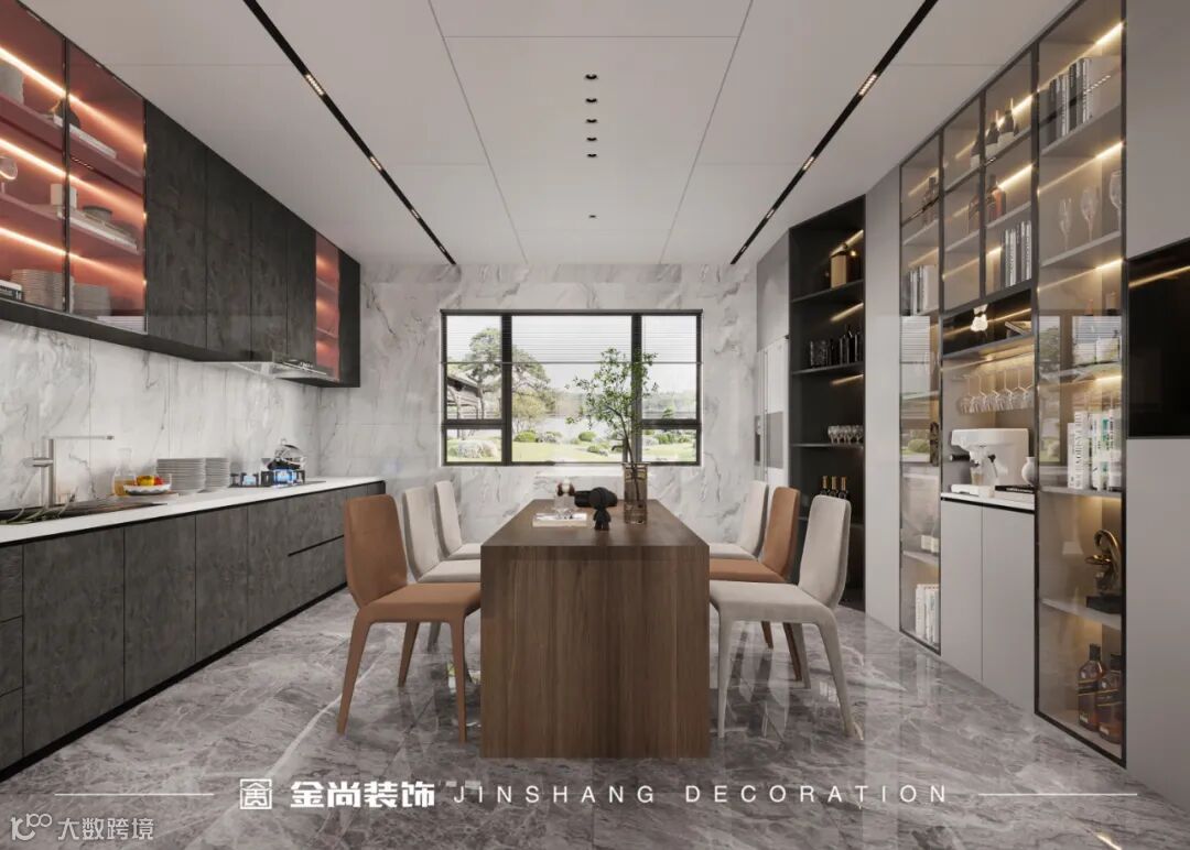从客厅的透明推拉门穿过,来到厨餐厅。本案的餐厅和厨房是一体式的设计,厨区是设计师为居主精心打造的一个私人乐园,时尚轻奢的的现代酒柜,收纳着琳琅满目的名酒与高脚杯,彰显出居主高雅时尚的生活品味。围桌而落纯色餐椅,木质餐桌显得沉稳大气,时尚中透露着一丝贵气,坐在上面,仿佛整个人深深地卷入这个空间,没有烦恼,只有当下的宁静与美好。