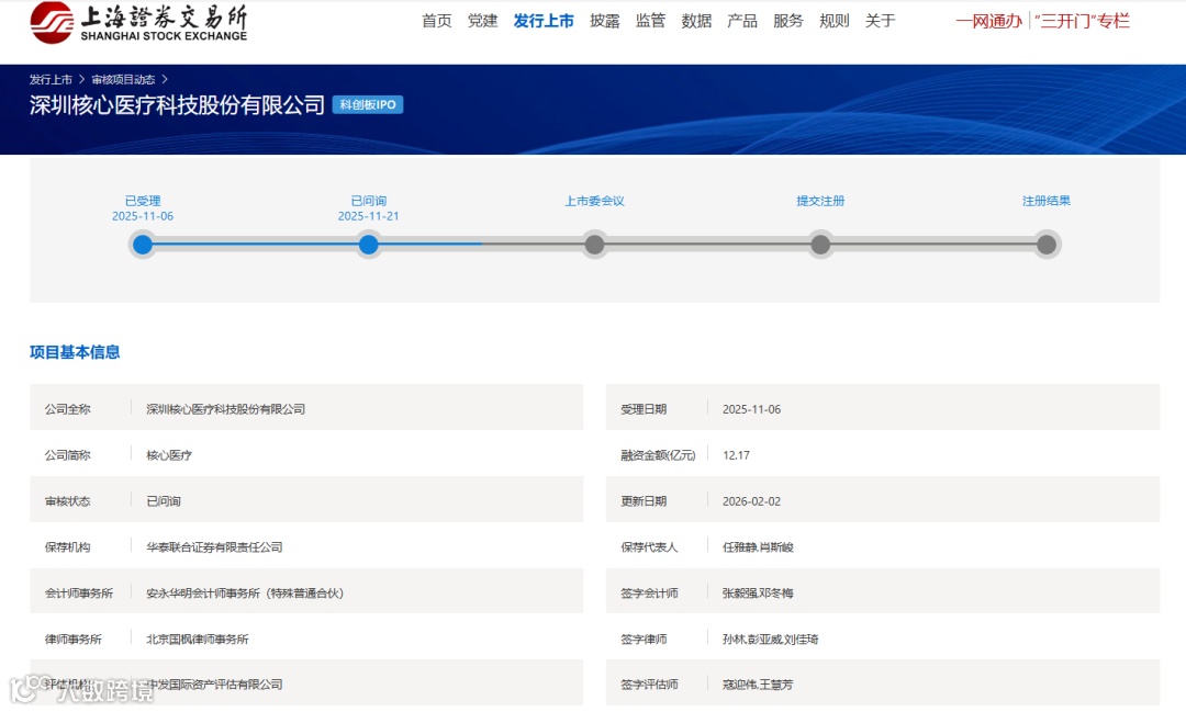 2026年2月2日,上交所官网显示,深圳核心医疗科技股份有限公司科创板IPO申请状态更新为“已问询”。