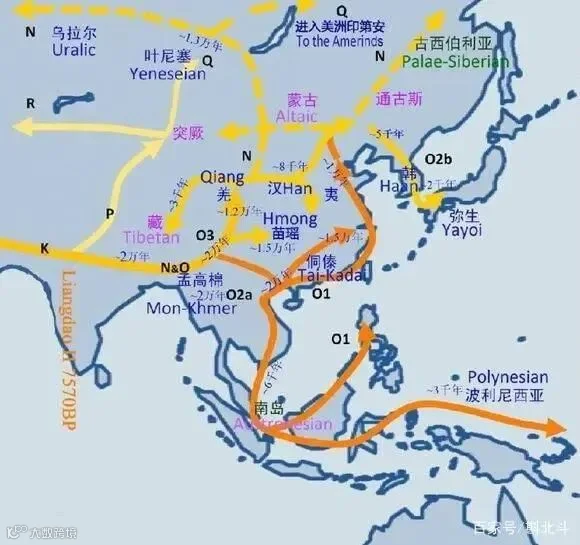 现代基因分析推测出的古人类在东亚的迁徙路线|图片来自网络
