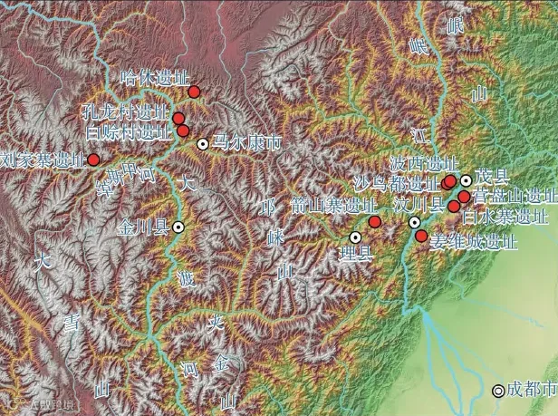 随后一千多年的时间里,仰韶文化在大渡河流域形成了多个定居点,位置在孔龙村遗址、白赊村遗址、刘家寨遗址,而在岷江流域形成的定居点,位于波西遗址、沙乌都遗址、箭山寨遗址、营盘山遗址、白水寨遗址、姜维城遗址。