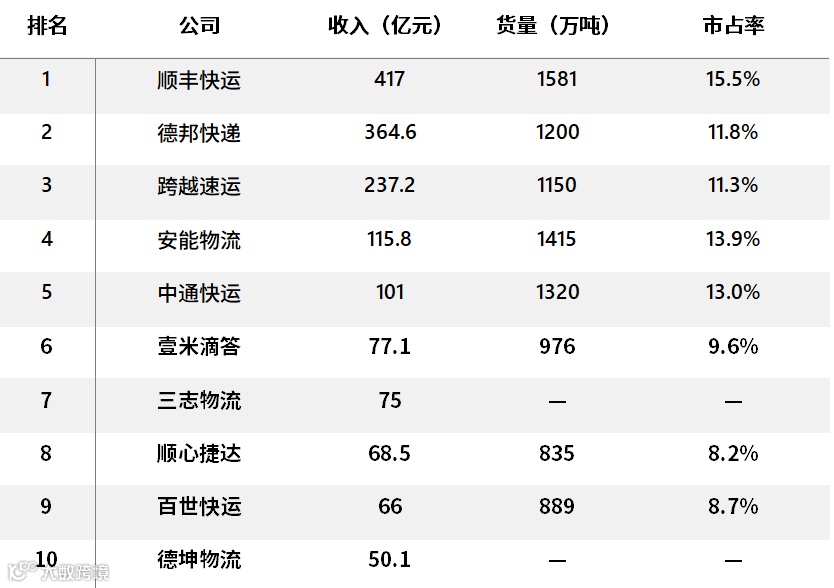 - 第一梯队:顺丰快运以417亿元营收领跑行业;