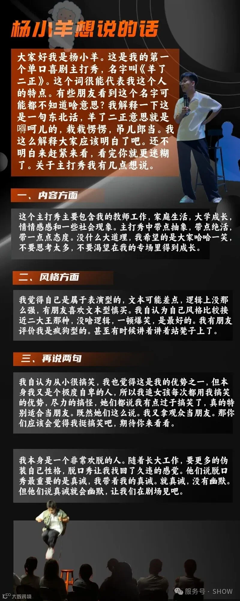1. 希望大家放松情绪,享受演出。演出期间演员有可能和您互动,这是脱口秀的一部分,我们没有恶意。