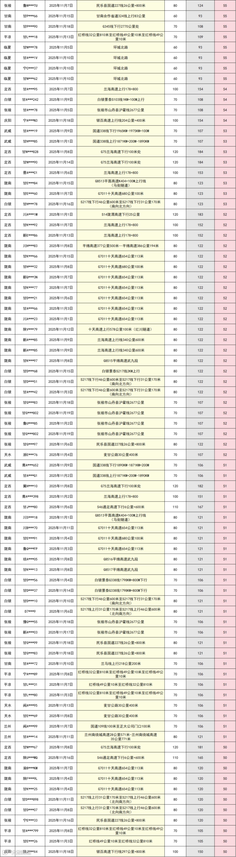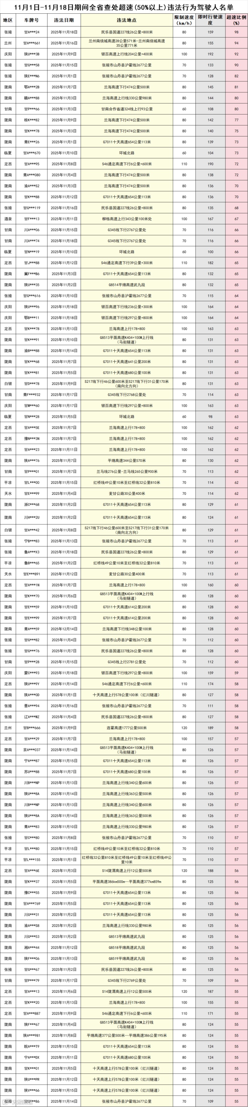 为切实加强道路交通安全管理,预防和减少因超速引发的道路交通事故。全省公安交管部门不断强化源头隐患排查、重点路段管控、重点违法整治、精准警示宣传等各项措施,持续严查超速等各类交通违法行为。现将 11月1日—11月18日期间全省查处的超速50%以上小型汽车相关信息予以警示曝光。公安机关将依据相关法律法规,对此类违法行为严格执法、严肃处理。希望广大驾驶人从中汲取教训、引以为戒,自觉遵守交通法规,杜绝超速行驶等危险驾驶行为,共同维护安全、有序、畅通的道路交通环境!