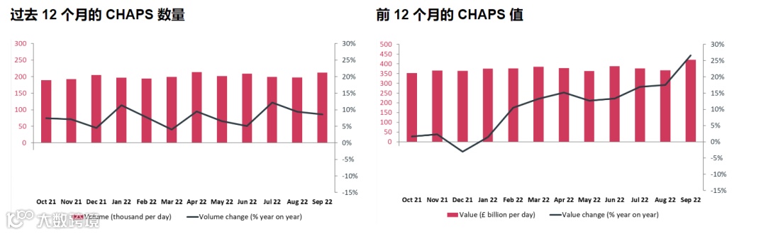 2022年9月,CHAPS在22个结算处理日内处理了 450万笔付款,价值8.9万亿英镑。日均成交量为 211,925,较2021年9月增长8.6%。日均价值为4220亿英镑,比2021年9月增长26.6%。