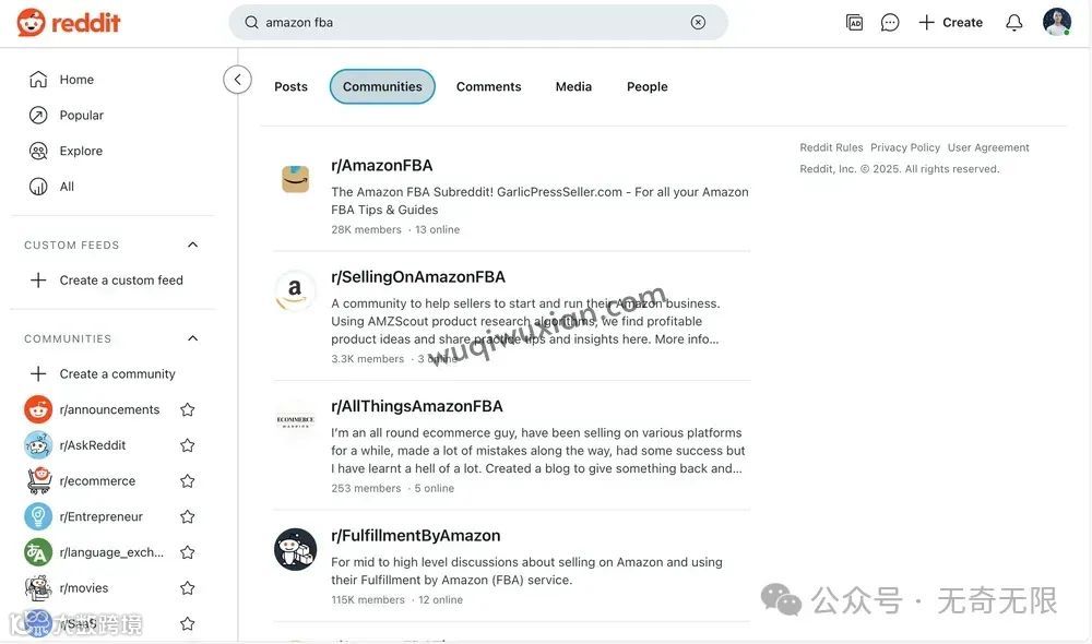 Reddit 目前支持帖子、群组、评论和人物的关键词搜索,你可以根据自己的需要选择不同的类别。一般我们建议搜索群组,在搜索结果列表中,你可以看到群组的成员数量和简单的介绍,不过人气较高的亚马逊卖家群组一般排名比较靠前。