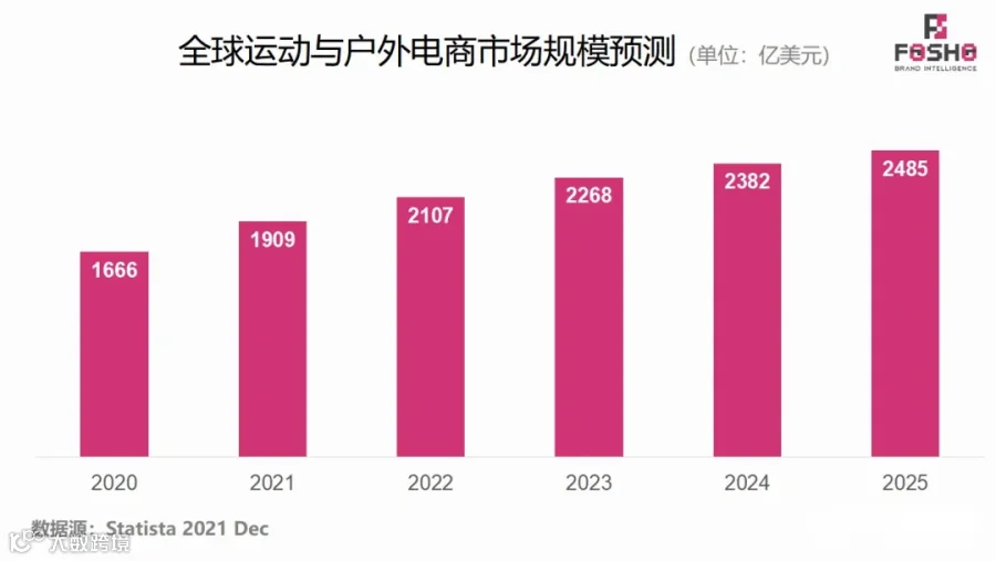 全球户外用品行业可谓如火如荼。据 Statista的电商行业数据统计,预计 2022年,运动&户外电商规模将达到2107亿美元, 2025年将达到 2485 亿美元。同时,户外用品消费群体持续扩大,2023年预计将有超过13亿人爱上户外运动这一健康的生活方式。渗透率已经在2019年超过10%,这一数据预计在2023年提升至17.3%。