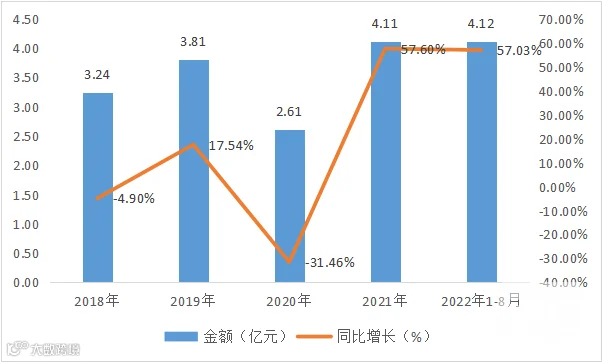 2022年1-8月,我国羽绒睡袋出口87.46万个,同比增长37.53%,出口金额4.12亿元,同比增长57.03%。