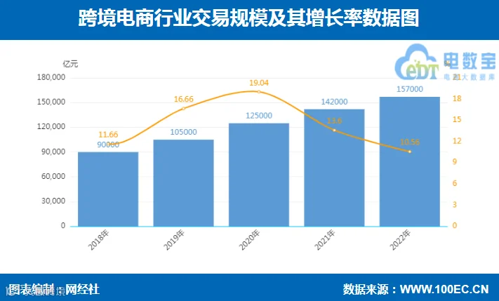 报告显示,2022年中国跨境电商市场规模达15.7万亿元,较2021年的14.2万亿元同比增长10.56%。此外,2018-2021年跨境电商市场规模(增速)分别为9万亿元(11.66%)、10.5万亿元(16.66%)、12.5万亿元(19.04%)、14.2万亿元(13.6%)。