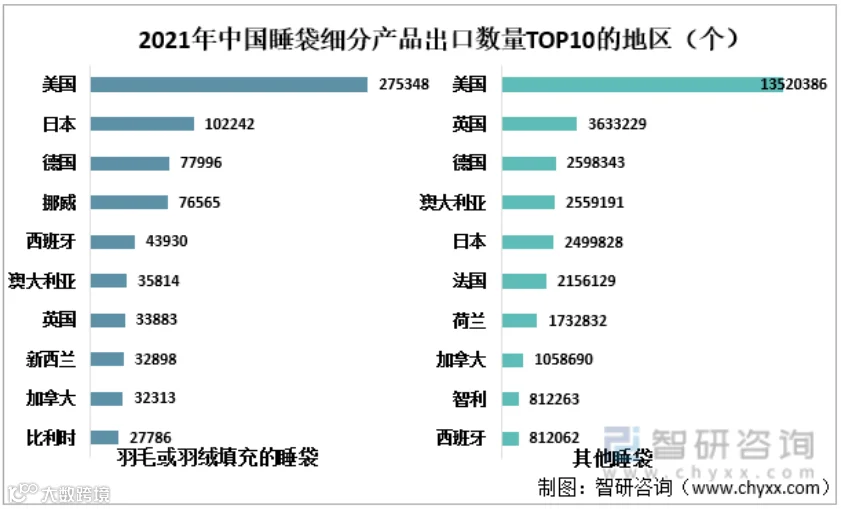 根据羽绒睡袋海关编码查询,从睡袋细分产品的出口量方面来看,2021年中国羽毛或羽绒填充的睡袋出口量排名前三的地区是美国、日本和德国,其中美国为中国羽毛或羽绒填充的睡袋的最大出口国,2021年中国羽毛或羽绒填充的睡袋出口至美国的数量为275348个;2021年中国其他睡袋出口量排名前三的地区为美国、英国以及德国,其出口量分别为13520386个、3633229个、2598343个,由此可见,美国不仅仅是中国羽毛或羽绒填充的睡袋的最大出口国,也是其他睡袋的最大出口国。