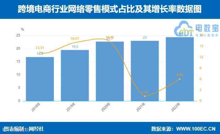 2022年中国出口跨境电商市场规模达12.3万亿元,较2021年的11万亿元同比增长11.81%;进口跨境电商市场规模达3.4万亿元,较2021年的3.2万亿元同比增长6.25%。模式结构方面,2022年中国跨境电商的交易模式中跨境电商B2B交易占比达75.6%,跨境电商B2C交易占比24.4%。近年来,跨境电商零售模式发展迅猛,政策助力等也带来了在跨境电商中模式占比的提升。