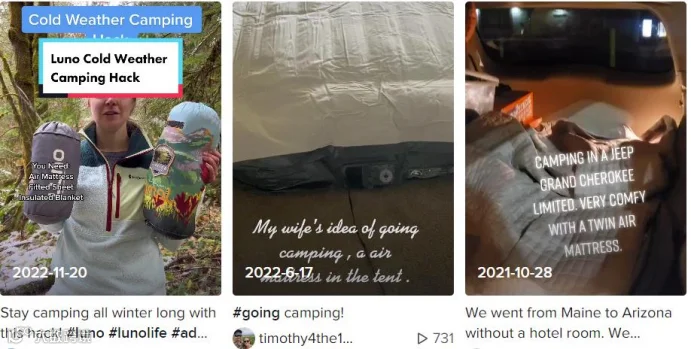 TikTok上有不少用户通过添加“#露营”、“#户外运动”、“#充气床垫”等话题分享自己户外露营的装备、充气床垫的使用说明、展示户外充气床垫等视频。