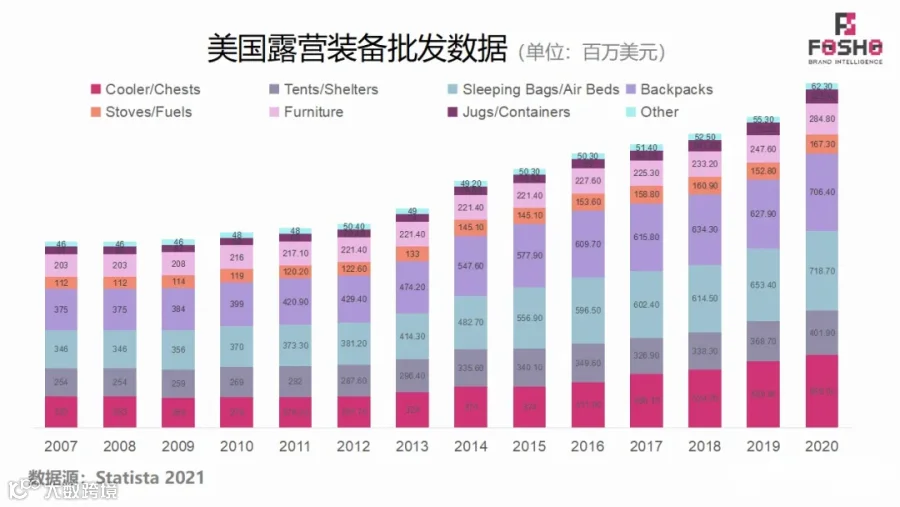 露营市场的增长,也体现在具体产品的需求增长上。根据露营装备的批发数据统计,至 2020 年,冰箱、睡袋/床、户外家居和背包等产品有较明显的增长。