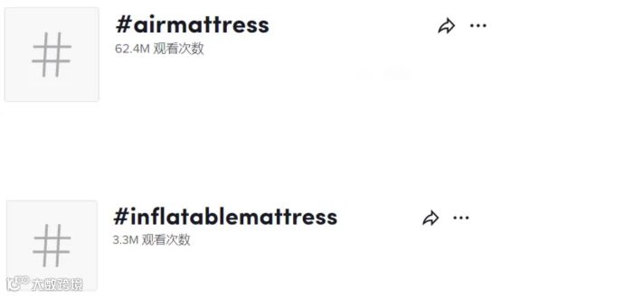 TikTok上”#airmattress(气垫)“观看次数达6240万次、”#inflatablemattress(充气床垫)“话题观看次数达330万,可见TikTok用户对于户外充气床垫的关注度非常高。