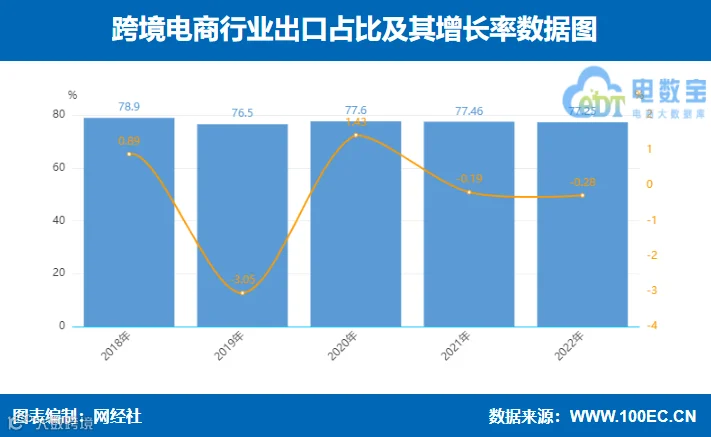 报告显示,2022年中国跨境电商交易额占我国货物贸易进出口总值42.07万亿元的37.32%。此外,2018-2021年跨境电商行业渗透率分别为29.5%、33.29%、38.86%、36.32%。跨境电商行业渗透率随之行业的发展及传统外贸增长有关,总体来说渗透率在稳步的提升。目前独立站等模式的出现,给跨境电商企业更多的渠道选择,也将带动行业规模的发展。进出口结构方面,2022年中国跨境电商出口占比达到77.25%,进口比例22.75%。跨境电商进出口结构总体相对稳定,但随着进口市场的不断扩大,市场占比也将不断提升。