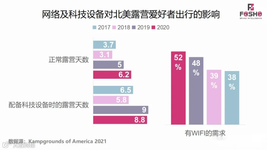 露营人群更希望能在露营时能够使用无线网络;科技产品的应用也使露营人群更愿意延长露营活动的时间。