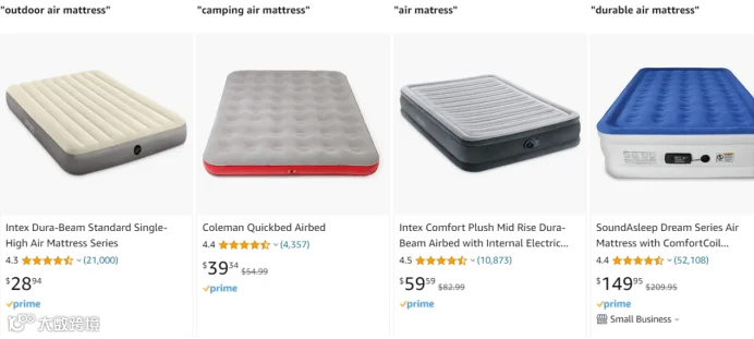 通过在Amazon美国站上搜索,"outdoor air mattress"(户外气垫)、"camping air mattress"(露营气垫)、" air mattress"(充气床垫)等相关词汇,会出现一系列户外便携充气床垫的链接。