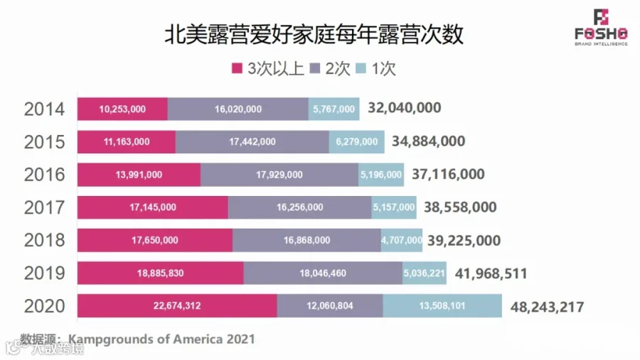 北美家庭中有 67% (86,100,000 万)的家庭表示曾经有露营的经历或爱好。2020 年参与露营活动的家庭总数达 4824 万,其中一年露营3次以上的数量也逐年增加,2020 年达到 2267 万,从 2014 年至 2020 年,增长率为 121%。