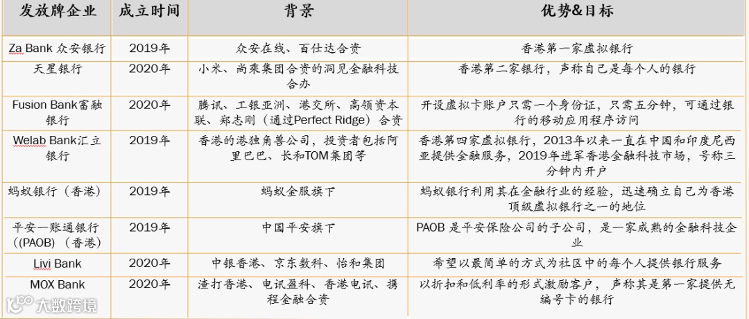 首张香港虚拟银行牌照于2019年发出,根据规定,虚拟银行的主要业务是零售银行业务,即使虚拟银行是没有实体分行机构,但必须在香港设有实体总部。