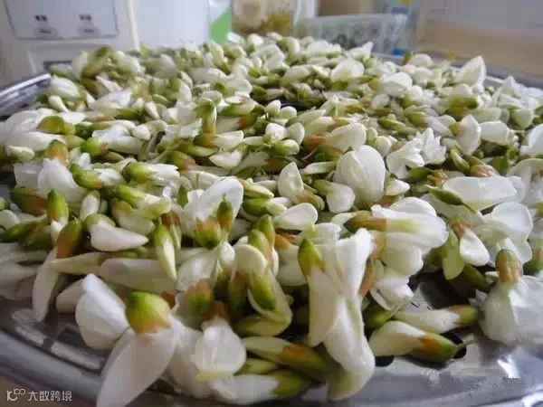 1、洗净的槐花在通风处控干水份(一天左右)。