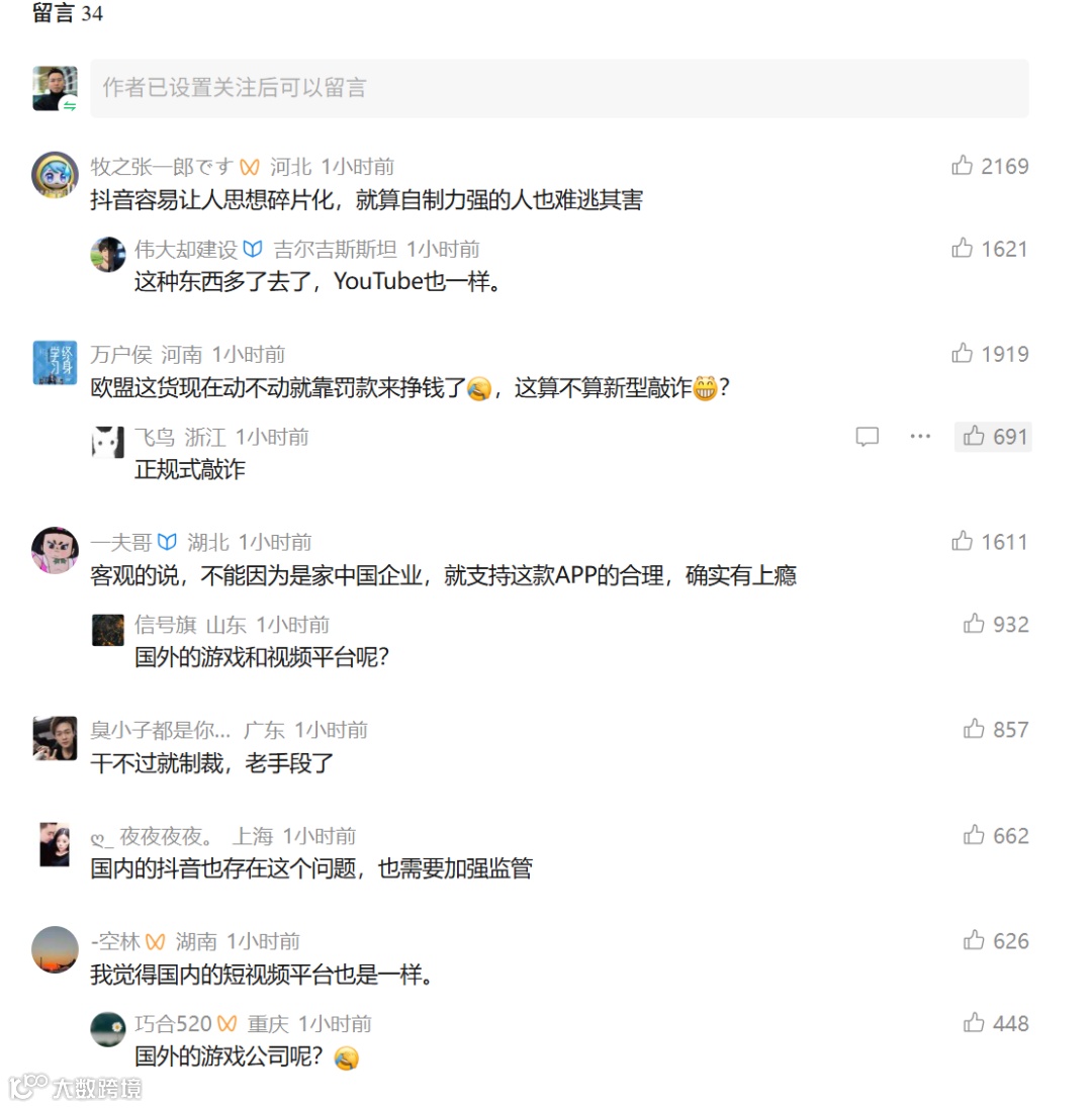 诸多事实表明,欧盟的监管并非“双重标准”,更非针对中国企业。此前,欧盟已针对美国社交媒体平台X(原推特)展开多次调查,2025年12月更是因其“蓝勾认证”付费即可获得、存在误导用户的问题,处以1.2亿欧元罚款,这一处罚同样依据《数字服务法》的透明度义务条款。此外,欧盟还曾对Meta、YouTube、Temu等多家国际巨头启动调查,涉及非法内容传播、广告合规、数据访问等多个领域。从本质上看,欧盟的核心诉求是推动所有在欧运营的数字平台,承担起相应的“设计责任”,改变过去“最大化用户参与度”优先于用户权益保护的行业现状,而TikTok作为在欧拥有庞大用户群体的超大型平台,自然被纳入严格监管范围。 -