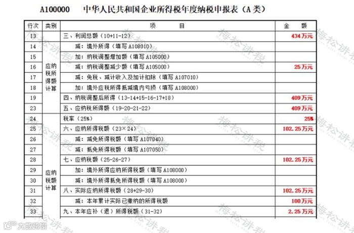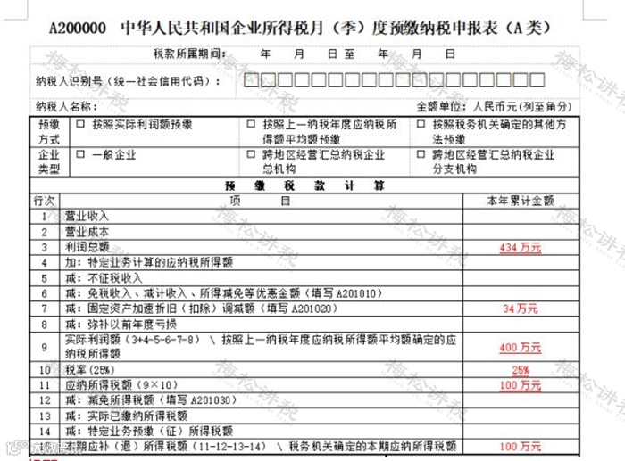 - 预缴所得税 = (434 - 34) × 25% = 100万元