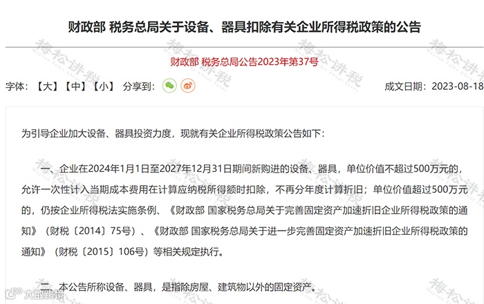 - 根据财税〔2023〕37号文,企业在2024年1月1日至2027年12月31日期间新购进的设备、器具(不含房屋、建筑物),单位价值不超过500万元的,允许一次性计入当期成本费用,在计算应纳税所得额时扣除,不再分年度计提折旧。