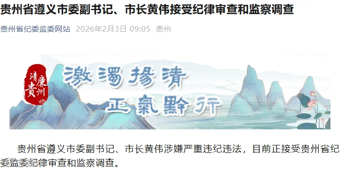 市委副书记、市长黄伟涉嫌严重违纪违法,目前正接受贵州省纪委监委纪律审查和