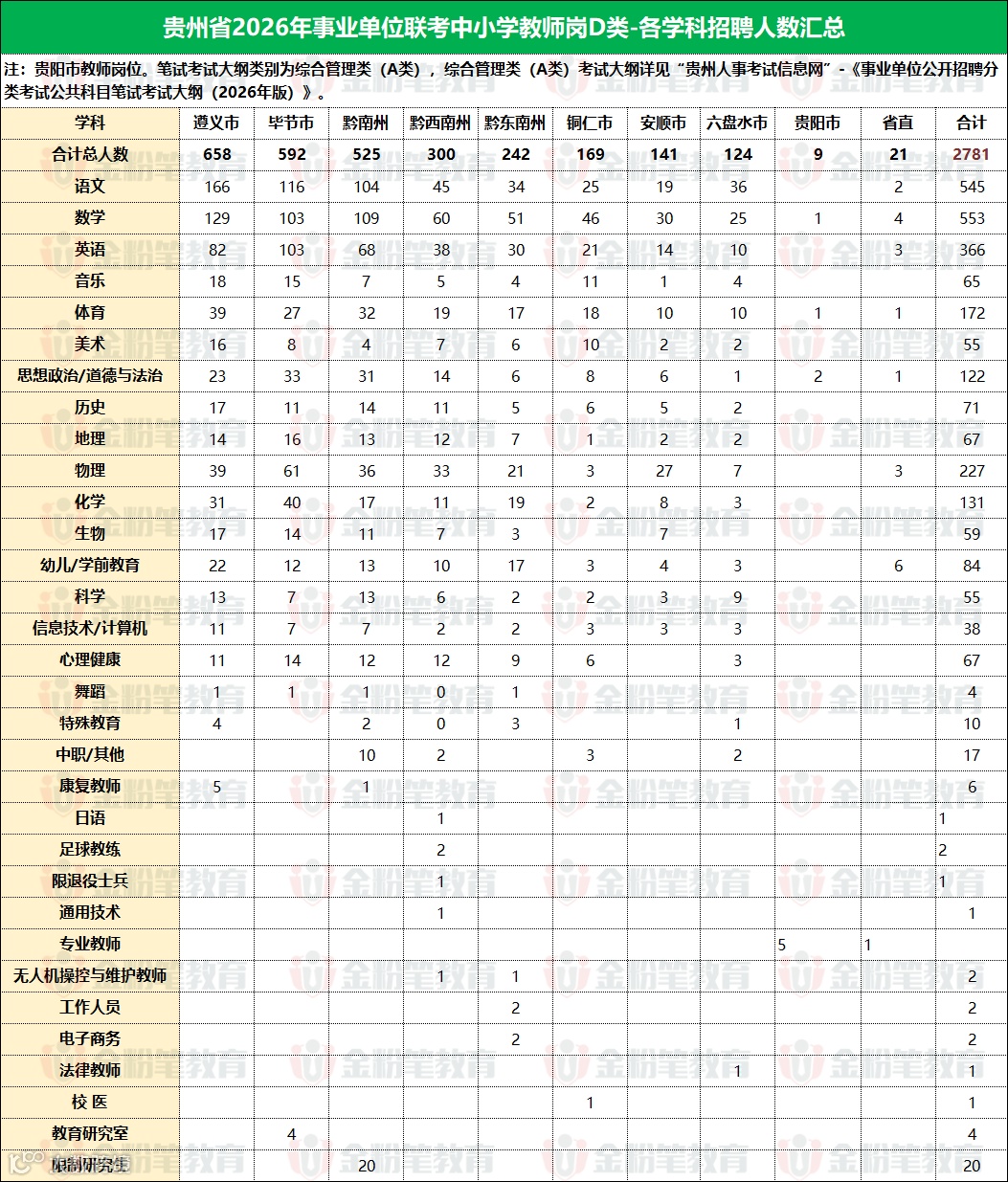 2026年贵州省事业单位联考公告已全部公布,贵州联考中小学、幼儿园教师岗共计招聘2781人,贵州省联考各地各学科教师招聘人数如下: