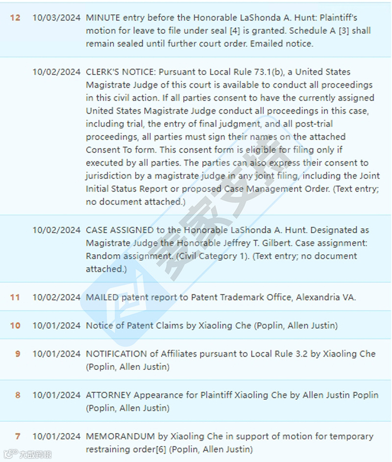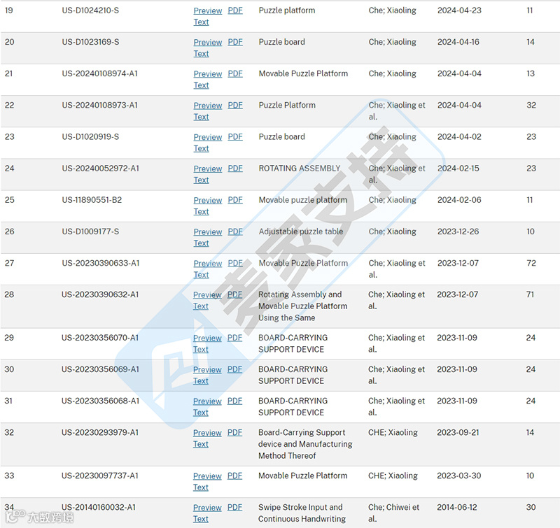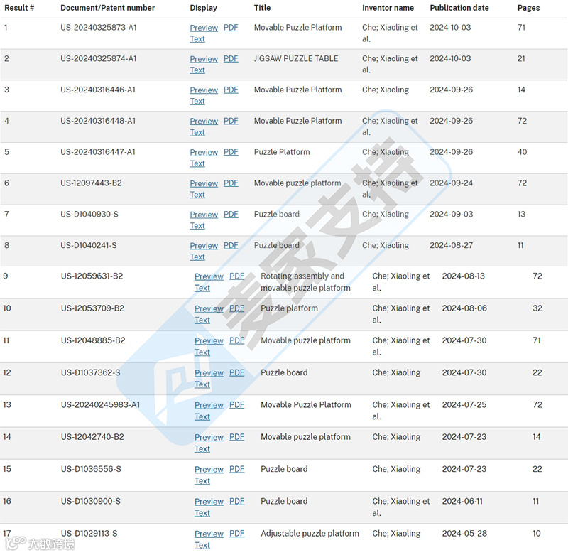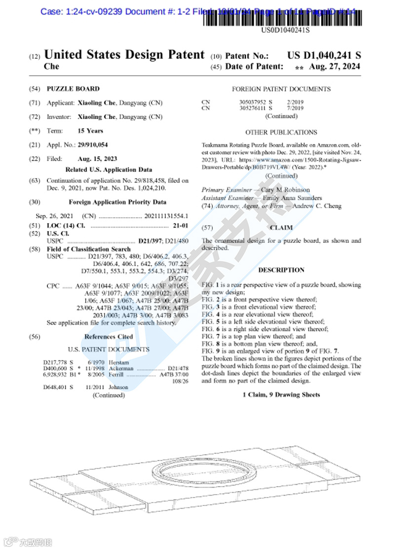 国庆节期间国人卖家Xiaoling Che在两天时间分别委托AVEK和bishop两个律所在伊利诺伊州发起两起专利维权案,经麦家支持排查发现,Xiaoling Che在美国注册有玩具相关专利高达30余个,跨境卖家应注意规避。本次涉案维权的是专利号为:D1040241的一款拼图板,于2024年8月27日在美国下证。