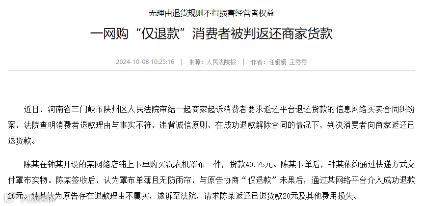 以往消费者提出“仅退款”要求时,一般情况下都会顺利通过申请,但是现在不仅平台不同意,法院也不允许。